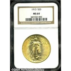 <B>1913<$20> MS64 NGC.</B></I> Medium lemon and subtle olive colors ensure the originality of this satiny Saint-Gaudens Twenty. Luster grazes are few in number, although the occasional contact mark precludes a higher grade. The Capitol building is well struck, and the major devices have suitable definition. A scarce issue in Choice condition. <BR><BR><B>Important notice:</B> Heritage usually auctions material at the rate of 200-250 lots per hour. On some occasions eBay Live bid software or the Internet may not be able to keep up with the pace of the auction. We recommend placing a realistic absentee bid now as insurance to avoid disappointment. Occasionally the auctioneer may eliminate or reject an eBay Live bid, and the auctioneer may also reopen a lot after the close of the eBay live bidding (usually because we missed an audience bid), and may reject your bid even if it shows you as the winning bidder. By bidding via eBay Live, you agree that Heritage may award the lot to another bidder at its sole discretion under the circumstances described above or any other reasonable circumstances. Since eBay bids are not shown to us until we open the lot on the floor, we treat those bids just like floor bids. In most cases the floor responds before the eBay bid is presented to us, due to Internet lag time, so for consistency we have made it a policy that floor bids are always considered first over tie eBay live bids. Also please note that all Heritage lots purchased through eBay Live carry a 20% Buyer's Premium. Please make sure you read the Terms and Conditions before you bid. </span></font></tr></table></td></tr></table>