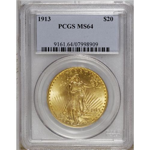 <B>1913<$20> MS64 PCGS.</B></I> A pleasing 48-star example from a surprisingly elusive early issue. The orange-tinted yellow-gold surfaces have attractive luster, and the devices are generally well struck, though the hair is slightly weak. A single small cut on Liberty's torso keeps this delightful coin from achieving Gem status.