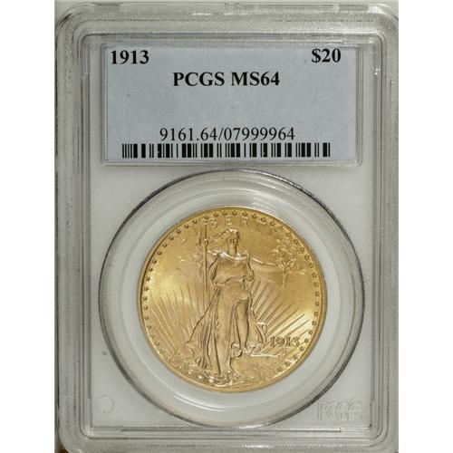 <B>1913 $20 MS64 PCGS.</B></I> An extensive selection of 1913 Saint-Gaudens twenties culminates with this radiant golden-orange example. The surfaces are display excellent sharpness for the issue and are draped in appealing reddish-gold patina. Only rarely does this more challenging early P-mint appear finer.<BR><BR><b>Shipping:</b> Coin/Currency (<a target="_blank" href="http://www.heritageauctions.com/common/shipping.php">view shipping information</a>)