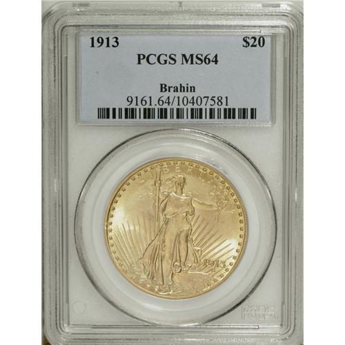 <B>1913 $20 MS64 PCGS.</B></I> Ex: Brahin. The 1913 double eagle, with a mintage of 168,838 business strikes, can be found with little difficulty in grades MS60 through MS63. Near-Gems are more challenging, and Gem and better coins are rare. The MS64 specimen presented in this lot displays vibrant luster exuding from peach-gold surfaces. Bold execution is apparent on the design elements, including the panes on the Capitol building, and on Liberty's face, fingers, and toes. Well preserved surfaces reveal just a few small marks on the lower part of Liberty's gown, and on the eagle's left wing.<BR><BR><b>Shipping:</b> Coin/Currency (<a target="_blank" href="http://www.heritageauctions.com/common/shipping.php">view shipping information</a>)