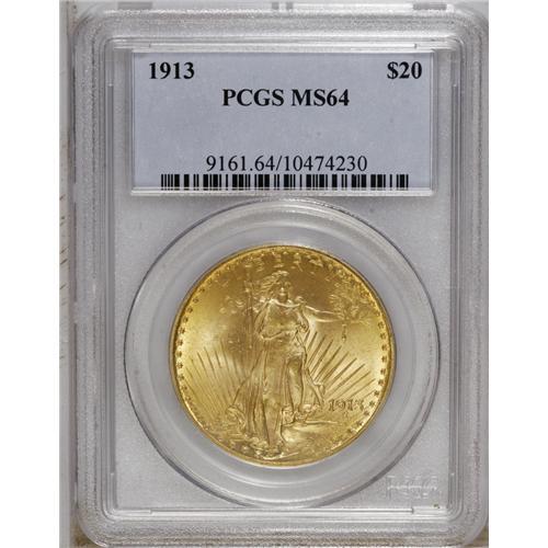 <B>1913<$20> MS64 PCGS.</B></I> The simple lack of availability for this date belies its mintage of over 168,000 pieces. This example has attractive honey-gold surfaces with peach accents, and the devices are solidly defined. Only a few scattered abrasions keep it from a higher grade. PCGS has certified just seven coins finer (9/06).