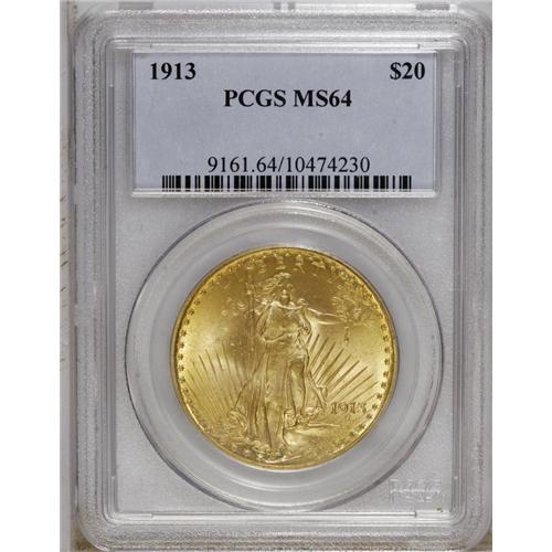 <B>1913 $20 MS64 PCGS.</B></I> The simple lack of availability for this date belies its mintage of over 168,000 pieces. This example has attractive honey-gold surfaces with peach accents, and the devices are solidly defined. Only a few scattered abrasions keep it from a higher grade. PCGS has certified just seven coins finer (11/06).<BR><BR><b>Shipping:</b> Coin/Currency (<a target="_blank" href="http://www.heritageauctions.com/common/shipping.php">view shipping information</a>)