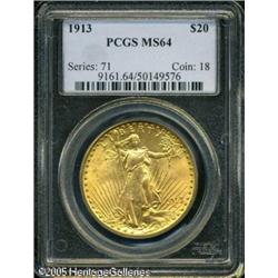 <B>1913 $20 MS64 PCGS.</B></I> This pleasing near-Gem exhibits shimmering lustrous surfaces that are lightly abraded, as this issue is frequently found. Conditionally scarce and rarely seen any finer. A satiny, well preserved specimen for the date collector. Population: 137 in 64, 6 finer (1/05). Lot:9531