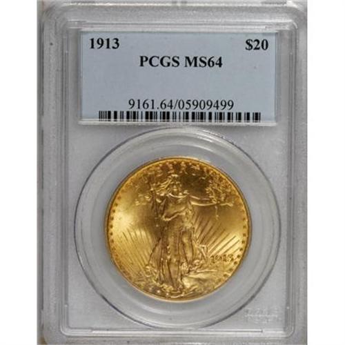 <B>1913 $20 MS64 PCGS.</B></I> Garrett and Guth, writing in their <I>Encyclopedia of U.S. Gold Coins, 1795-1933 </B></I>(2006), point out that the 1913 issue of Saint-Gaudens double eagles were struck "as the world teetered on the brink of war", which slowed the circulation of gold across international borders. Consequently, this date saw a limited mintage of 168,700 pieces. Well struck except for minor softness on Liberty's legs and torso, this conditionally scarce near-Gem displays excellent luster and lovely lime-gold and rose coloration. Some trivial marks are noted on the lower reverse field, beneath the eagle, and several tiny dark specks are likewise situated on the lower half of the reverse. The obverse is clean, and free of spots or noticeable blemishes. <BR><BR><B>Coin Engraver:</B> Augustus Saint-Gaudens<BR><BR><b>Shipping:</b> Coins & Currency (<a target="_blank" href="http://www.heritageauctions.com/common/shipping.php">view shipping information</a>)