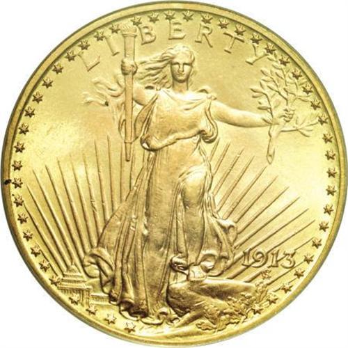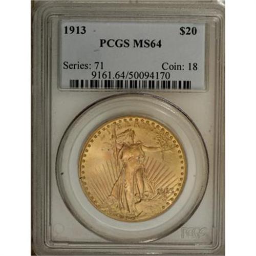 <B>1913 $20 MS64 PCGS.</B></I> Both sides of this well-preserved double eagle are remarkably clean for the grade, with the sole mark worthy of mention being a shallow scratch in the sun on the reverse. This date saw a limited mintage of 168,700 pieces, and while MS64 coins are not rare, Gem examples are. PCGS has graded only eight examples finer than MS64 (11/07). The strike is nearly full and both sides display pleasing pink-gold color. <BR><I>From The Jacob Collection of Saint-Gaudens Double Eagles.</B></I><BR><BR><B>Coin Engraver:</B> Augustus Saint-Gaudens<BR><BR><b>Shipping:</b> Coins & Currency (<a target="_blank" href="http://www.heritageauctions.com/common/shipping.php">view shipping information</a>)