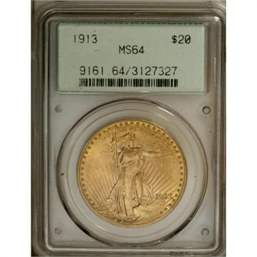 <B>1913 $20 MS64 PCGS.</B></I> This low mintage Saint-Gaudens twenty has sweeping luster, and the fields are splendidly free from both bagmarks and wispy grazes. Only a subtle mark on the hip denies a finer third party assessment. Superior for the grade, and encased in an old green label holder.<BR><BR><B>Coin Engraver:</B> Augustus Saint-Gaudens<BR><BR><b>Shipping:</b> Coins & Currency (<a target="_blank" href="http://www.heritageauctions.com/common/shipping.php">view shipping information</a>)