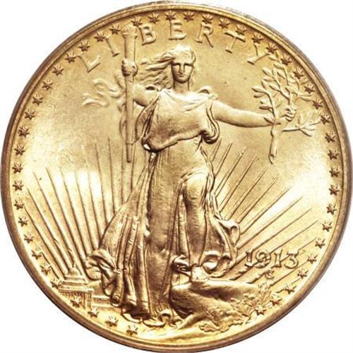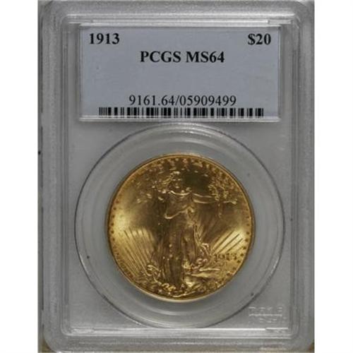 <B>1913 $20 MS64 PCGS.</B></I> Garrett and Guth, writing in their <I>Encyclopedia of U.S. Gold Coins, 1795-1933 </B></I>(2006), point out that the 1913 issue of Saint-Gaudens double eagles were struck "as the world teetered on the brink of war," which slowed the circulation of gold across international borders. Consequently, this date saw a limited mintage of 168,700 pieces. Well struck except for minor softness on Liberty's legs and torso, this conditionally scarce near-Gem displays excellent luster and lovely lime-gold and rose coloration. Some trivial marks are noted on the lower reverse field, beneath the eagle, and several tiny dark specks are likewise situated on the lower half of the reverse. The obverse is clean.<BR><BR><B>Coin Engraver:</B> Augustus Saint-Gaudens<BR><BR><b>Shipping:</b> Coins & Currency (<a target="_blank" href="http://www.heritageauctions.com/common/shipping.php">view shipping information</a>)