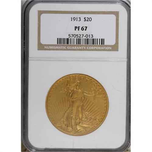 <B>1913 $20 PR67 NGC.</B></I> As with any proof double eagle, examples from this year are rare in the truest sense of the word, as can be easily ascertained by its minuscule mintage of 58 coins, which is second lowest in the series. Unlike the previous two issues, a greater percentage of the mintage seems to have been set aside and survives today. Still, probably no more than 35-40 individual coins are probably extant today. This number of survivors is somewhat higher than in previous years, and it is also a more accurate estimation of the number of coins remaining. David Akers' estimate of 20-25 coins seems a bit on the low side, especially when more than 60 pieces have been certified by both NGC and PCGS (5/07).<BR> As with most 1913 proofs, the matte surfaces on this coin exhibit a brownish-khaki coloration that is similar to the color seen on 1908 proofs, more so than on other dates in the series. The surfaces show a pronounced granularity, and when closely examined each of the thousands of individual granules sparkle in a random, diffuse manner. Even with the aid of magnification, the tiniest of surface flaws appear to be of mint origin. Whether this magnificent specimen could possibly be deserving of an even higher rating is up to the potential buyer. Either way, the importance of this classic 20th century gold issue cannot be underestimated and its technical and aesthetic merits are equally sound. Census: 10 in 67, 2 finer (5/07).<BR><BR><b>Shipping:</b> Coins & Currency (<a target="_blank" href="http://www.heritageauctions.com/common/shipping.php">view shipping information</a>)