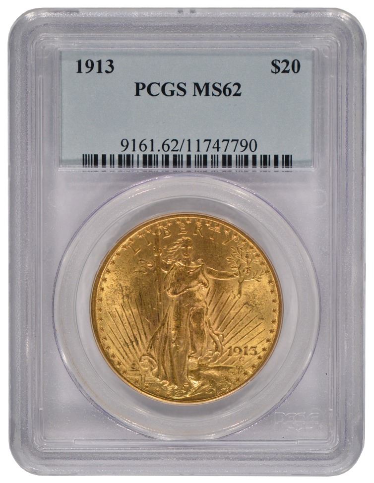 One 1913 $20 Saint Gaudens Double Eagle Gold Coin PCGS MS62.
