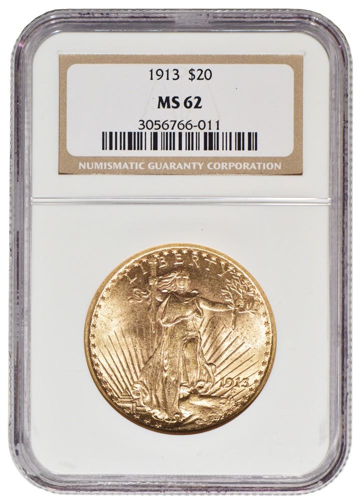 One 1913 $20 St Gaudens Double Eagle Gold Coin NGC MS62.