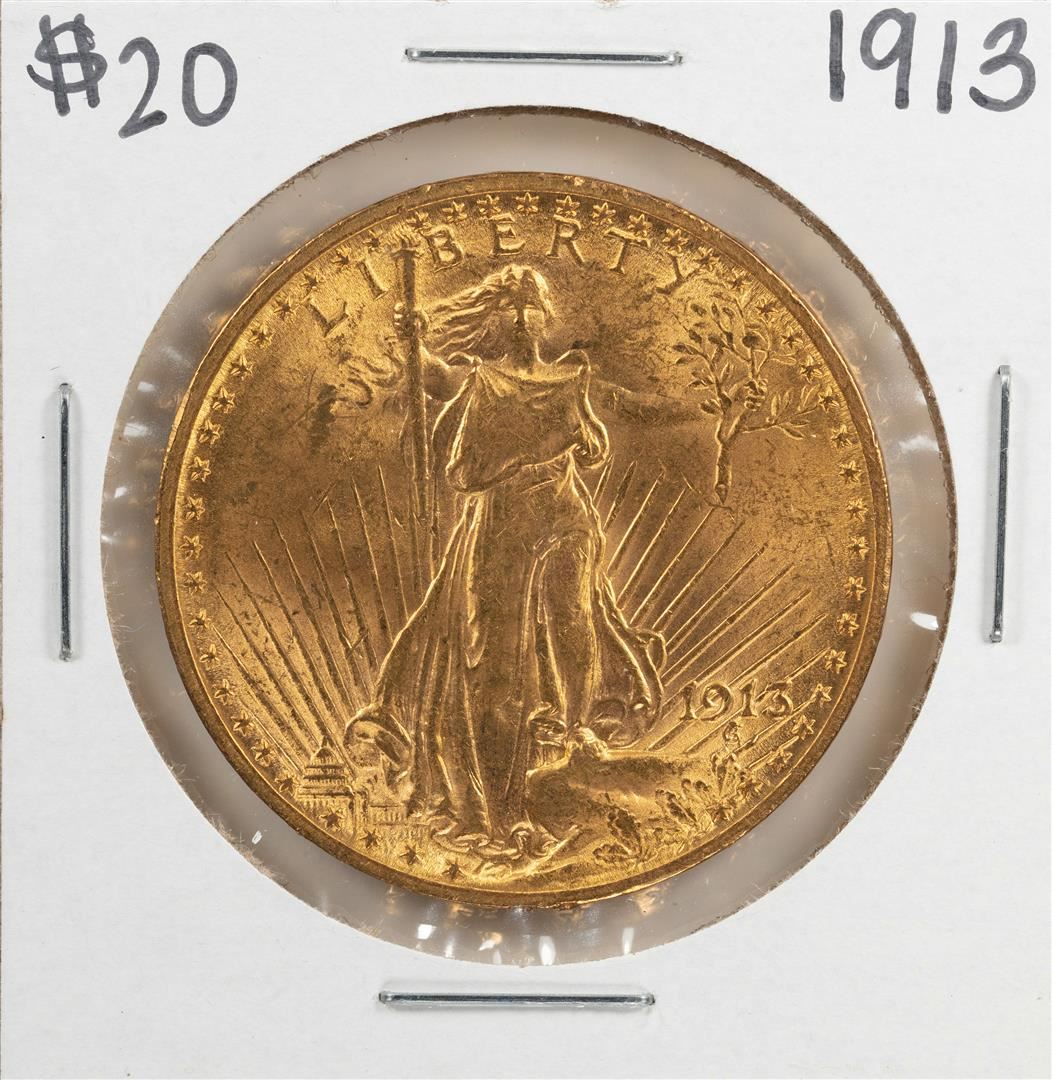 One 1913 $20 St. Gaudens Double Eagle Gold Coin.