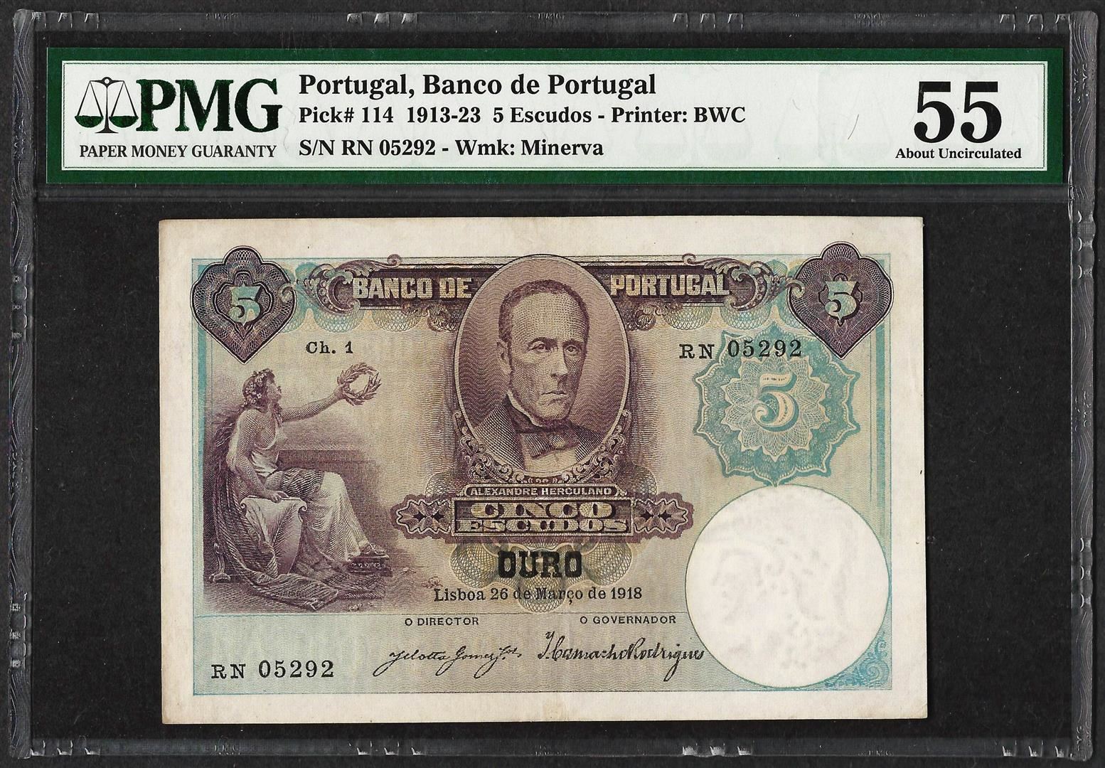 One 1913-23 Banco de Portugal 5 Escudos Bank Note PMG About Uncirculated 55. PMG Certified.