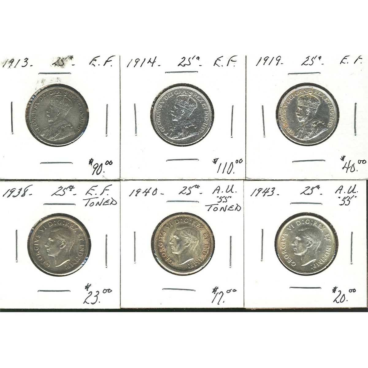 1913 25¢, 1914, 1919, 1938, 1940 & 1943. Lot of 6 coins all EF or better. (PBA).