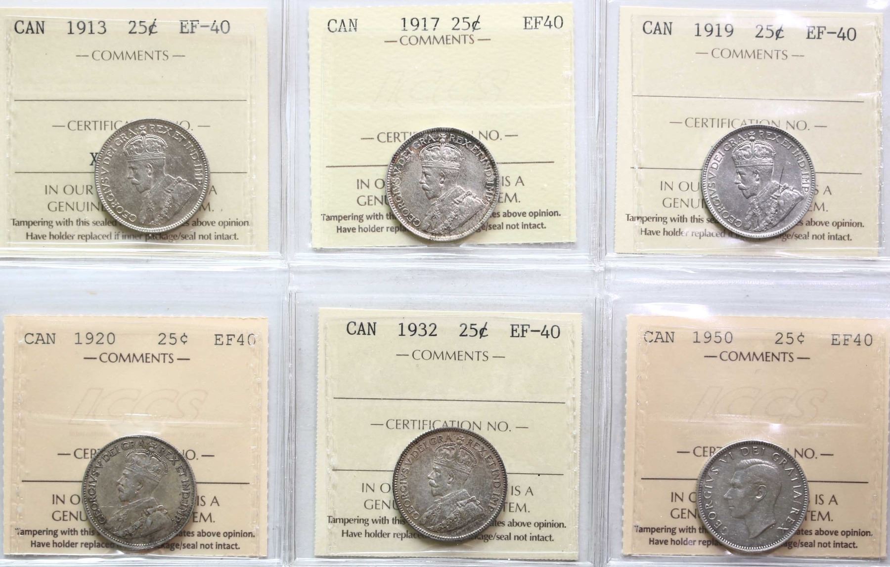1913 25¢, 1917, 1919, 1920, 1932, 1950, All 6 coins ICCS Extra Fine-40.