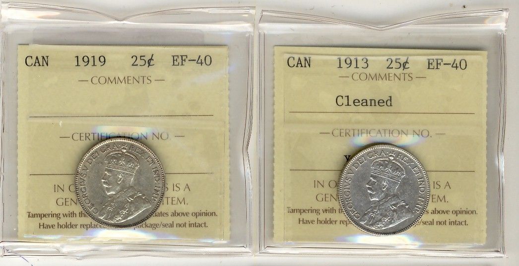 1913 25¢ & 1919 ICCS EF40. Lot of 2 coins with 1913 designated cleaned.