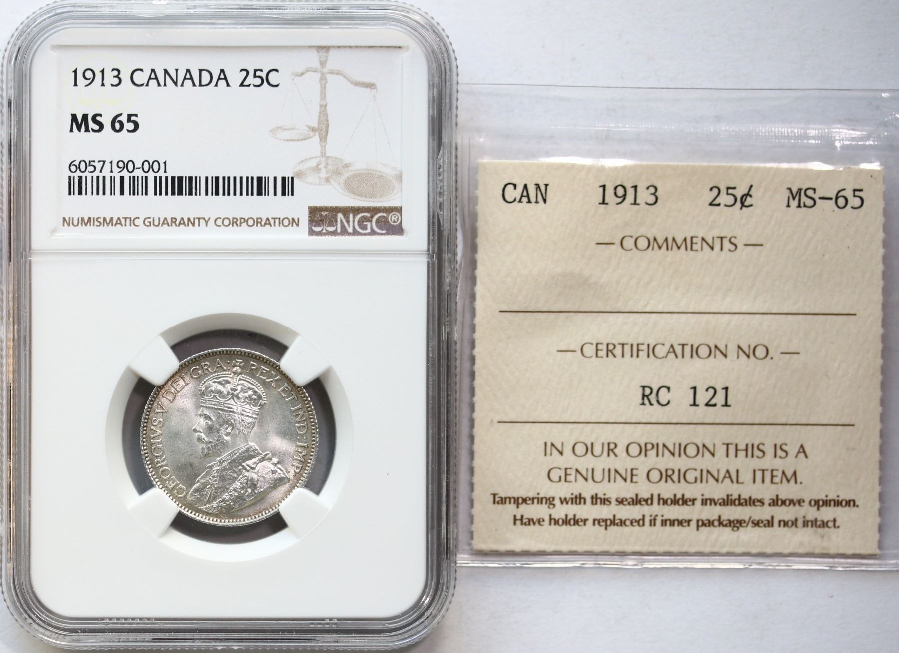 The cataloguer has taken every reasonable measure to ensure that all of the lots in this sale are as described and genuine. All raw coins and banknotes have been graded by the cataloger or the auction house which represent our best professional opinion. To grade coins and banknotes, we use Canadian grading standards, 42 years of experience and good conscience. However, grading is a subjective description in the opinion of the cataloger or the auction house. Among experts there are often differences of opinion on the grading and the eye appeal of a coin. The strike and the state of preservation are often debated. The Canadian Numismatic Company acts as an agent between consignors and buyers. The Canadian Numismatic Company does not guarantee that any coin or banknote cataloged will meet the standards, or the grade, of any third party grading companies. No warranty, whether impressed or implied. Items are as is, no warranty given. We cannot accept responsibility and waive all liability resulting in financial losses, and or incidentals accruing from the sale of any items, nor can we guarantee that items graded by third party services will grade the same if submitted to a different grading service or re-submitted to the same company. Statements by The Canadian Numismatic Company regarding the condition, the eye appeal, the strike and the population of items are for guidance only. All lots offered are sold "AS IS". Title to all lots remains with the auction house until paid for in full by the purchaser. But they are held at the risk of the purchaser once the time of the sale.