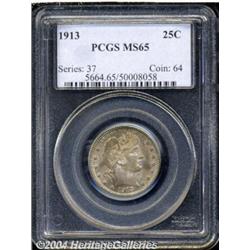 <B>1913<25C> MS65 PCGS.</B></I> The 1913-P is a long-recognized rarity among business strike Barber quarters, worth several hundred dollars even in XF condition. This exquisitely lovely Gem displays cinnamon-brown, olive-gray, and sea-green toning, along with full satiny luster, boldly struck features, and well preserved surfaces that only show a handful of tiny contact marks, all on the obverse. Population: 11 in 65, 3 finer (3/04).<BR><I>From the JFS Collection.</B></I> <BR><BR><B>Important notice:</B> Heritage usually auctions material at the rate of 200-250 lots per hour. On some occasions eBay Live bid software or the Internet may not be able to keep up with the pace of the auction. We recommend placing a realistic absentee bid now as insurance to avoid disappointment. Occasionally the auctioneer may eliminate or reject an eBay Live bid, and the auctioneer may also reopen a lot after the close of the eBay live bidding (usually because we missed an audience bid), and may reject your bid even if it shows you as the winning bidder. By bidding via eBay Live, you agree that Heritage may award the lot to another bidder at its sole discretion under the circumstances described above or any other reasonable circumstances. Since eBay bids are not shown to us until we open the lot on the floor, we treat those bids just like floor bids. In most cases the floor responds before the eBay bid is presented to us, due to Internet lag time, so for consistency we have made it a policy that floor bids are always considered first over tie eBay live bids. Also please note that all Heritage lots purchased through eBay Live carry a 20% Buyer's Premium. Please make sure you read the Terms and Conditions before you bid. </span></font></tr></table></td></tr></table>