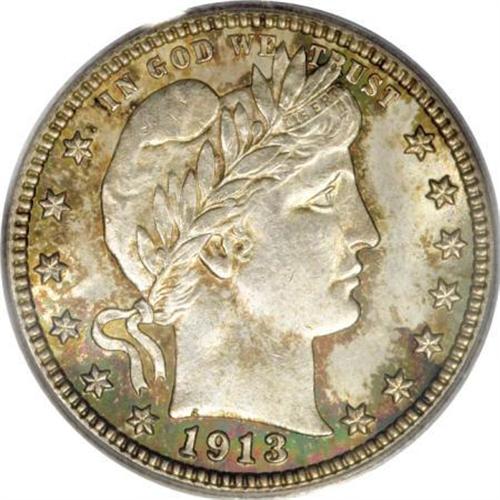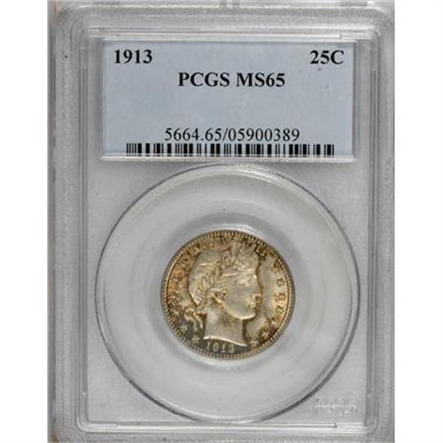 <B>1913 25C MS65 PCGS.</B></I> This pleasing Gem displays splashes of green, violet, and russet on the obverse, while the reverse shows light olive-green around the borders. Generally well struck, except for weakness in the upper right corner of the shield. A few ticks are noted on Liberty's portrait. Population: 19 in 65, 6 finer (9/07).<BR><BR><B>Coin Engraver:</B> Charles E. Barber<BR><BR><b>Shipping:</b> Coins & Currency (<a target="_blank" href="http://www.heritageauctions.com/common/shipping.php">view shipping information</a>)