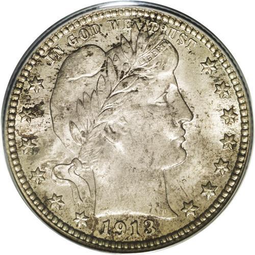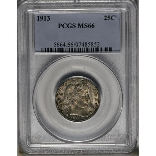 <B>1913<25C> MS66 PCGS.</B></I> The 1913 is a low mintage issue with only 484,000 pieces minted. Surprisingly few Gems were set aside, and today a mere five coins have been so graded by PCGS and NGC with just four finer (6/06). This is an attractive coin whose softly frosted mint luster shows a moderate amount of mottled olive-brown toning over each side. Sharply struck throughout with crisp definition in all areas, even the eagle's talons, and showing no obvious abrasions.