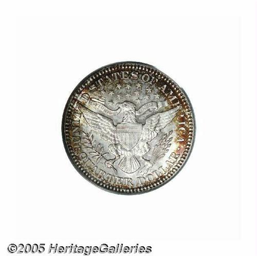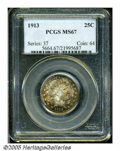 <B>1913<25C> MS67 PCGS.</B></I> A show-stopping '13-P Quarter, one of the more difficult Barber Quarter issues in the series at the Mint State level, being only slightly less rare than its better known S-mint counterpart in better (MS63 and higher) Uncirculated grades. This Superb Gem's best quality is its originality. The pristine surfaces are draped in mottled russet, orange, and sea-green hues, only complementing the underlying frostiness and amazing lack of contact marks. The reverse is somewhat lighter in tone with an essentially brilliant center. Currently, this one is tied with just one other at PCGS as the finest known example (6/05).