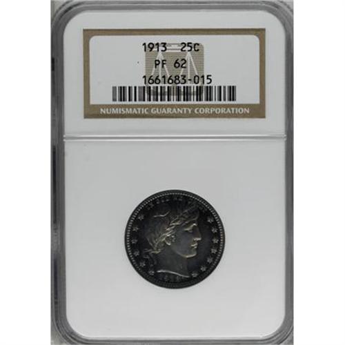 <B>1913 25C PR62 NGC.</B></I> NGC Census: (17/166). PCGS Population (22/155). Mintage: 613. Numismedia Wsl. Price for NGC/PCGS coin in PR62: $440. (#5699)<BR><BR><B>Coin Engraver:</B> Charles E. Barber<BR><BR><b>Shipping:</b> Coins & Currency (<a target="_blank" href="http://www.heritageauctions.com/common/shipping.php">view shipping information</a>\)