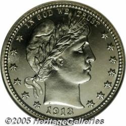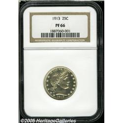 <B>1913 25C PR66 NGC.</B></I> The 1913 is the key to the proof Barber Quarter series as only 613 pieces were struck. This barely toned example has just the slightest hint of golden color as the coin is turned under a light. It is further enlivened by the unfathomable depth of mirrored reflectivity seen in the fields. Population: 37 in 66, 22 finer (2/05).<BR><I>From The Richard J. Chouinard Collection of United States Coins, Part Three.</B></I>