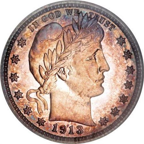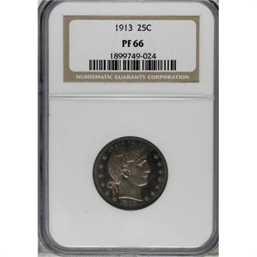 <B>1913 25C PR66 NGC.</B></I> Deep tones of violet, ruby-red, and cobalt-blue adorn the expertly preserved surfaces of this Premium Gem proof quarter. Sharply struck with highly reflective fields, this coin has tremendous eye appeal. From an original mintage of just 613 pieces, and conditionally scarce at or above the PR66 grade level. Census: 38 in 66, 21 finer (11/07).<BR><BR><B>Coin Engraver:</B> Charles E. Barber<BR><BR><b>Shipping:</b> Coins & Currency (<a target="_blank" href="http://www.heritageauctions.com/common/shipping.php">view shipping information</a>)