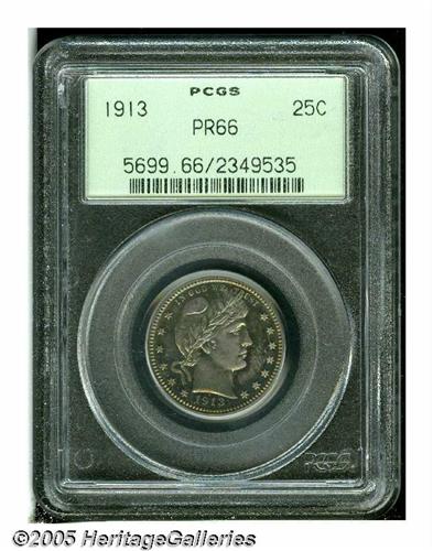 <B>1913<25C> PR66 PCGS.</B></I> Proponents of originality will certainly appreciate this carefully preserved proof. Both sides display a similar mixture of antique-gold and cobalt-blue patina. Deep reflectivity is noted at all angles, as is razor sharp striking definition. One of only 613 proofs manufactured in 1913.