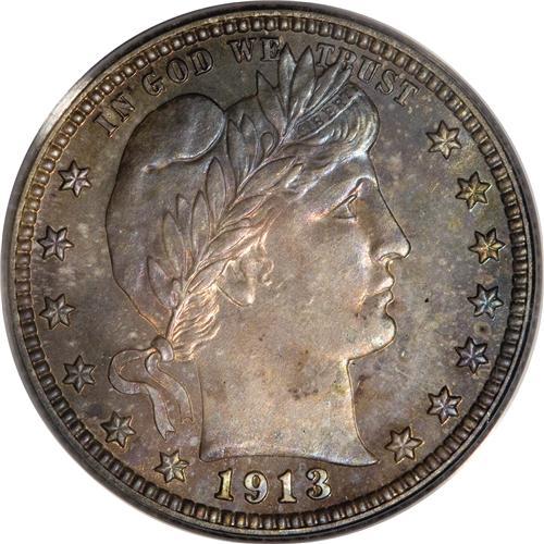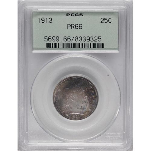 <B>1913 25C PR66 PCGS.</B></I> This Gem proof displays a mix of cobalt-blue, purple, lavender, and orange toning on the obverse, and cobalt-blue accented with crimson on the reverse. A crisp strike manifests itself in sharp definition on the design elements, with no areas revealing hints of weakness. Close inspection reveals no significant marks on either side. Housed in a green-label holder. Population: 27 in 66, 12 finer (2/07).<BR><BR><b>Shipping:</b> Coins & Currency (<a target="_blank" href="http://www.heritageauctions.com/common/shipping.php">view shipping information</a>)