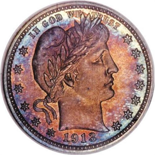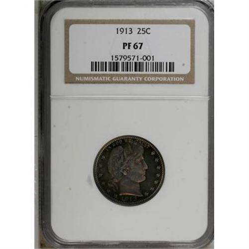 <B>1913 25C PR67 NGC.</B></I> A stunning beauty that possesses a rainbow of deep toning, including lilac, blue, russet, green, and yellow, over deeply mirrored fields and fully lustrous devices. Undoubtedly a full and strong underlying cameo proof. The toning enthusiast will enjoy this remarkable beauty. Census: 16 in 67, 5 finer (1/08).<BR><BR><B>Coin Engraver:</B> Charles E. Barber<BR><BR><b>Shipping:</b> Coins & Currency (<a target="_blank" href="http://www.heritageauctions.com/common/shipping.php">view shipping information</a>)