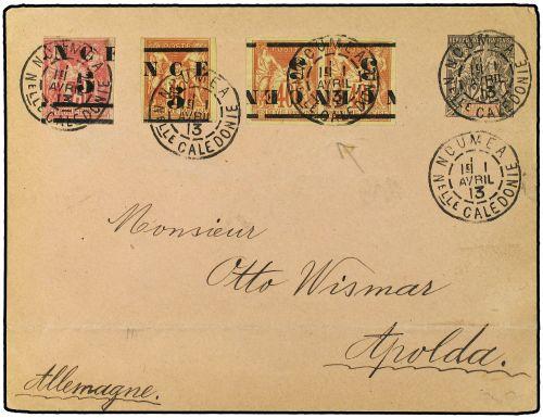 1913 25c. "Sage" postal stationery envelope uprated surcharged ´N.C.F. 5´ on 40c. & 75c, together with similar overprint but INVERTED on pair 40c. All cancelled Noumea date stamp.