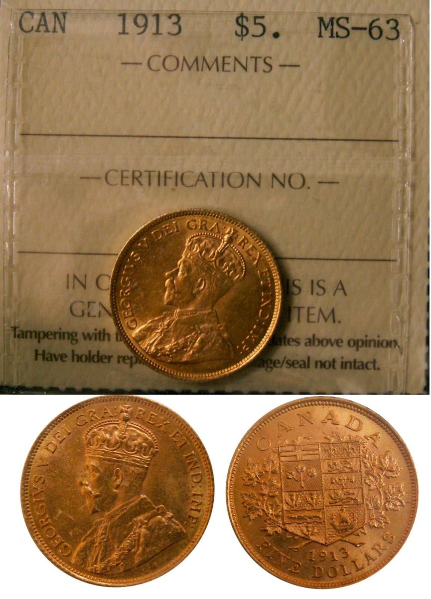 1913 $5 Gold ICCS MS63. Very nice, flashy'.