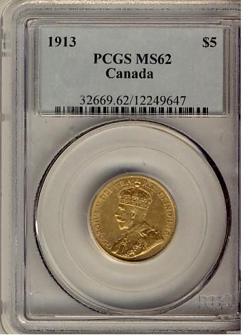 1913 $5 Gold PCGS MS62, lots of lustre.