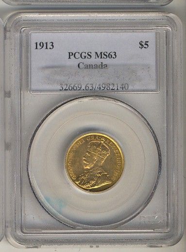 1913 $5 Gold PCGS MS63. Strong lustre with nice fields.