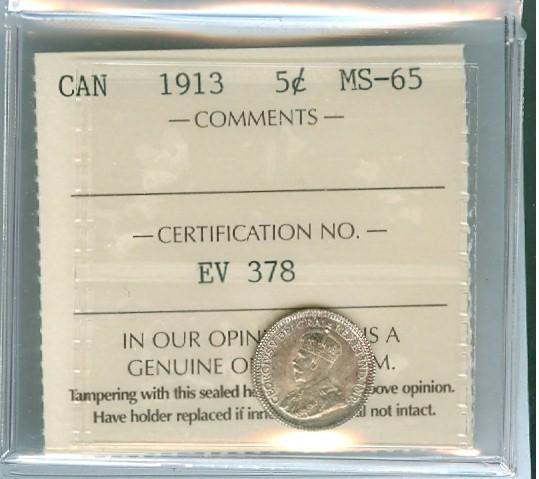 1913 5¢ ICCS MS65. Quite attractive golden tone on both obv and rev.