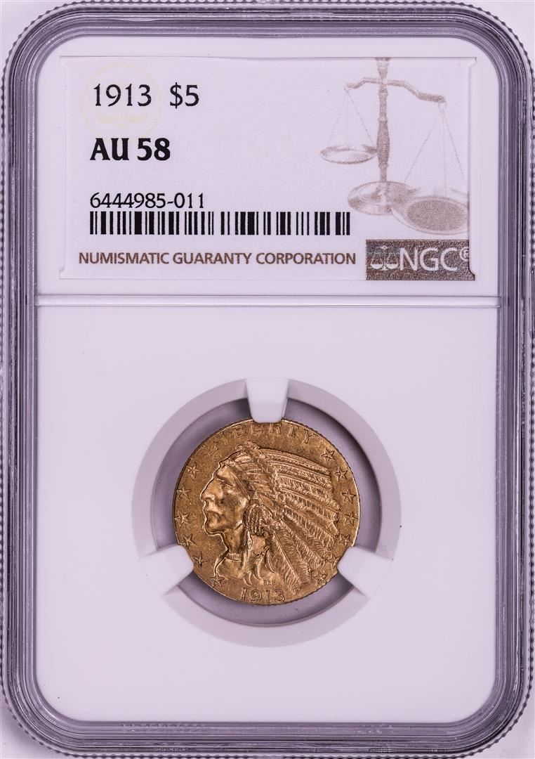 One 1913 $5 Indian Head Half Eagle Gold Coin NGC AU58. NGC Certified.