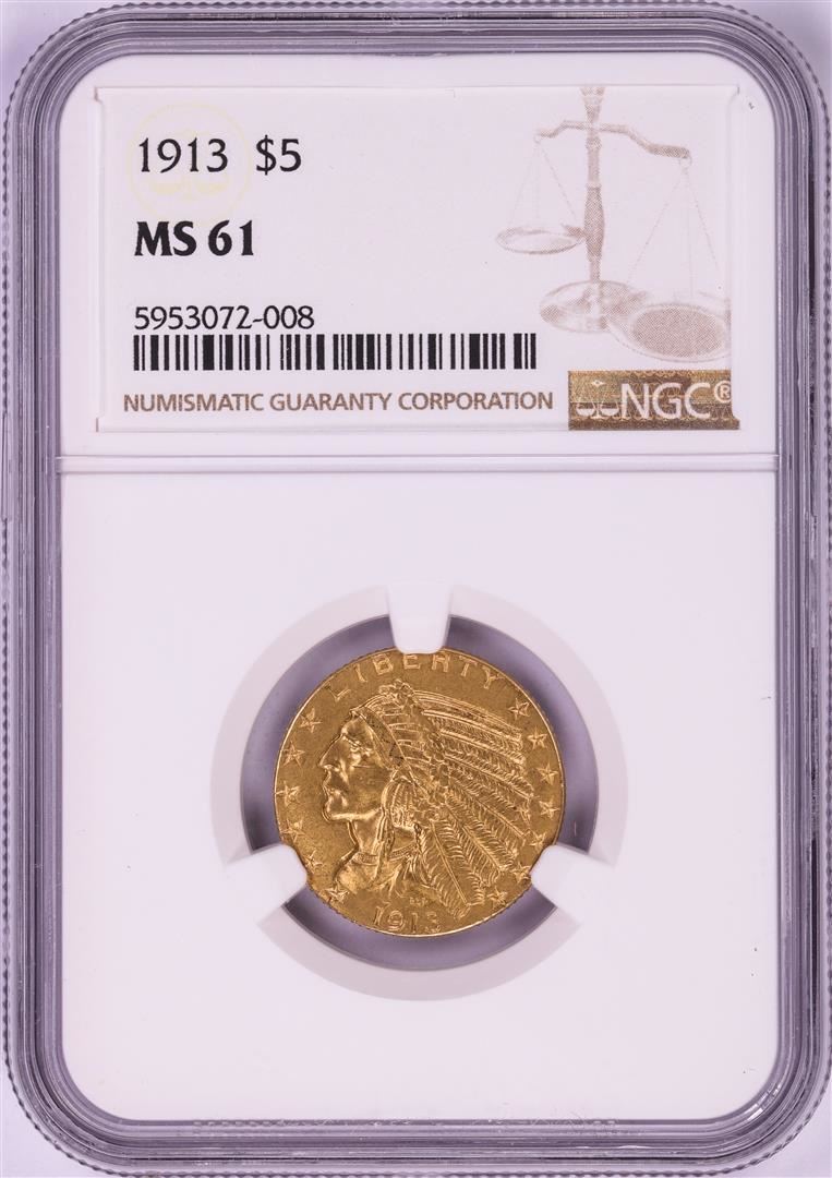 One 1913 $5 Indian Head Half Eagle Gold Coin NGC MS61. NGC Certified.