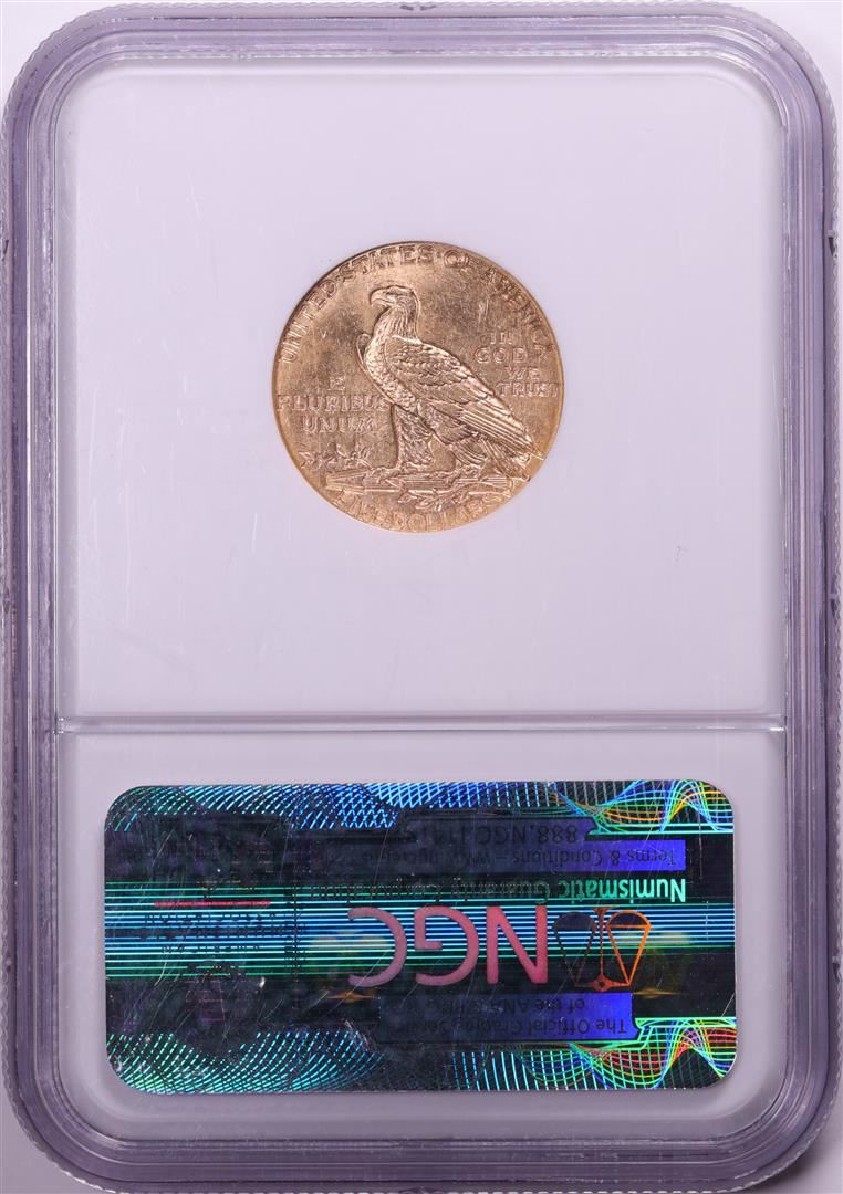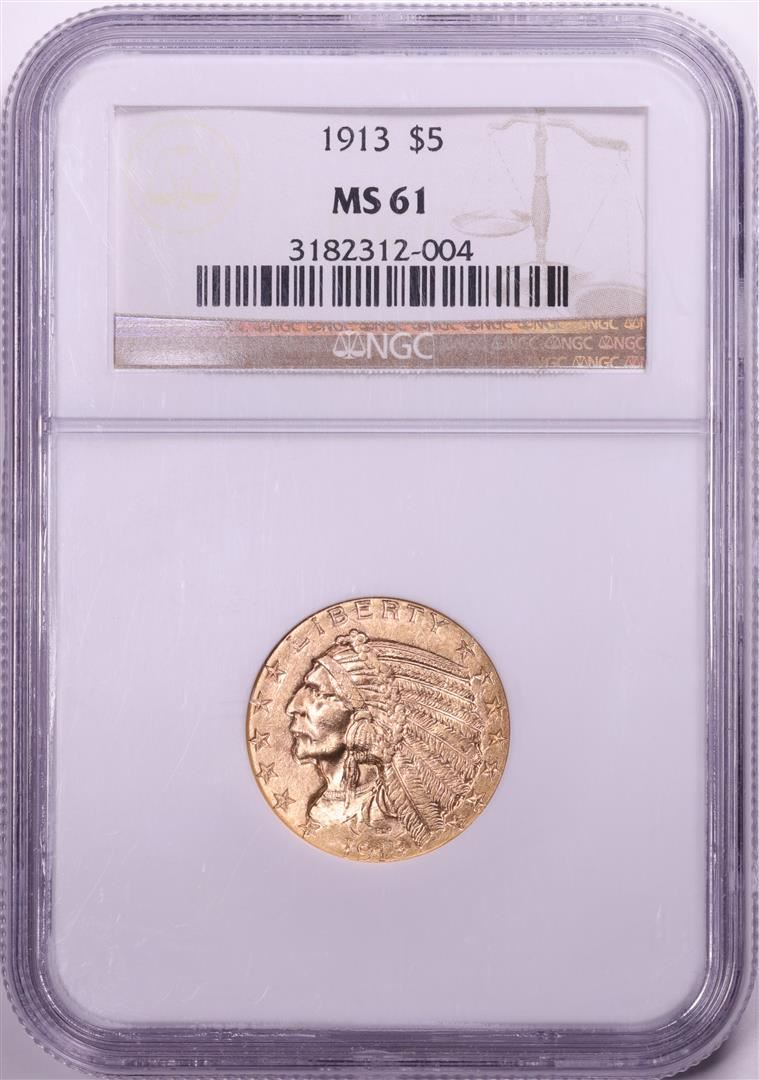 One 1913 $5 Indian Head Half Eagle Gold Coin NGC MS61. NGC Certified.