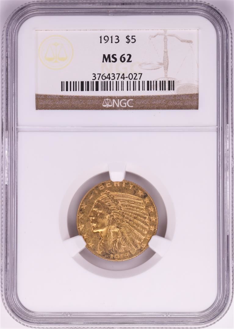 One 1913 $5 Indian Head Half Eagle Gold Coin NGC MS62. NGC Certified.