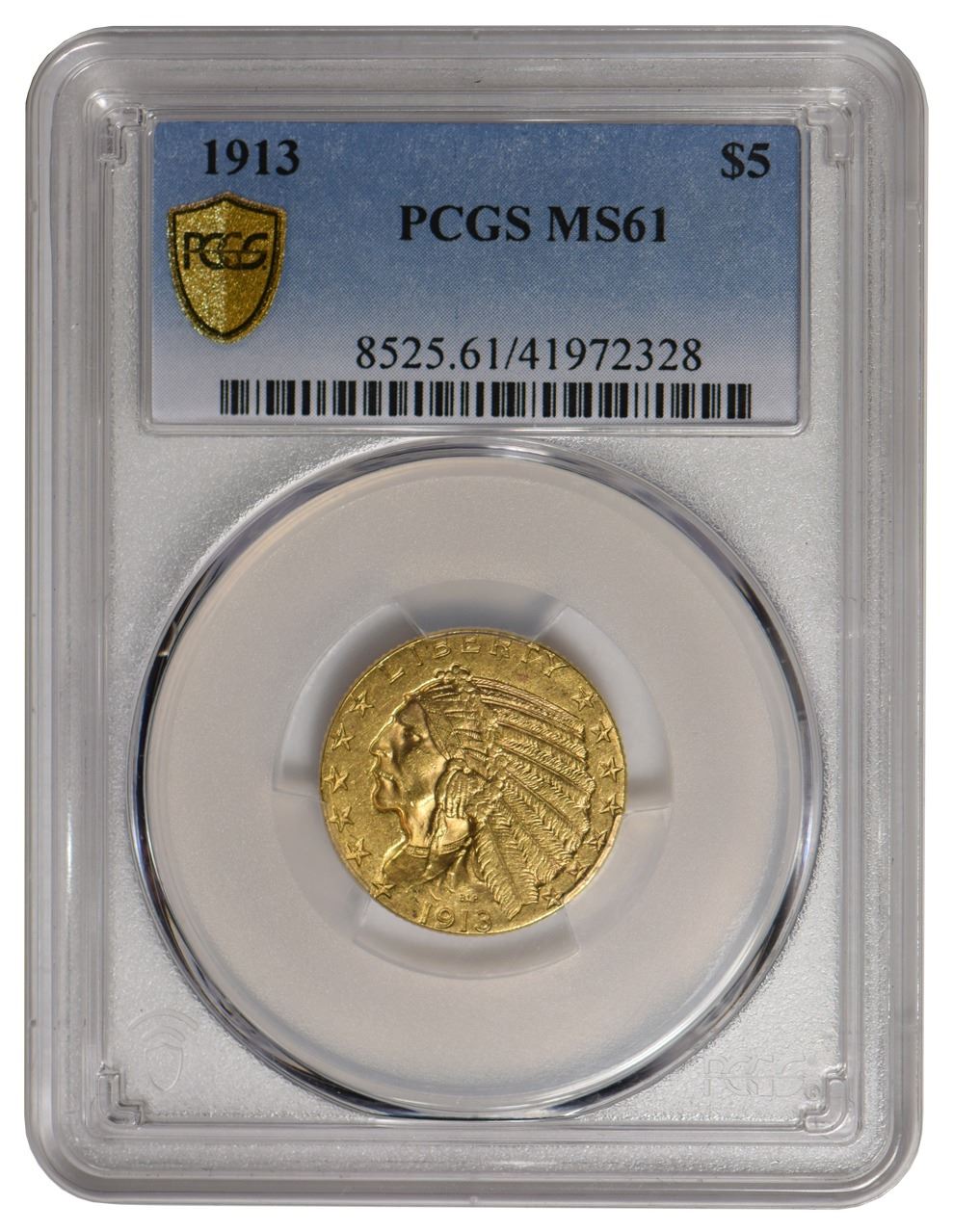 One 1913 $5 Indian Head Half Eagle Gold Coin PCGS MS61.