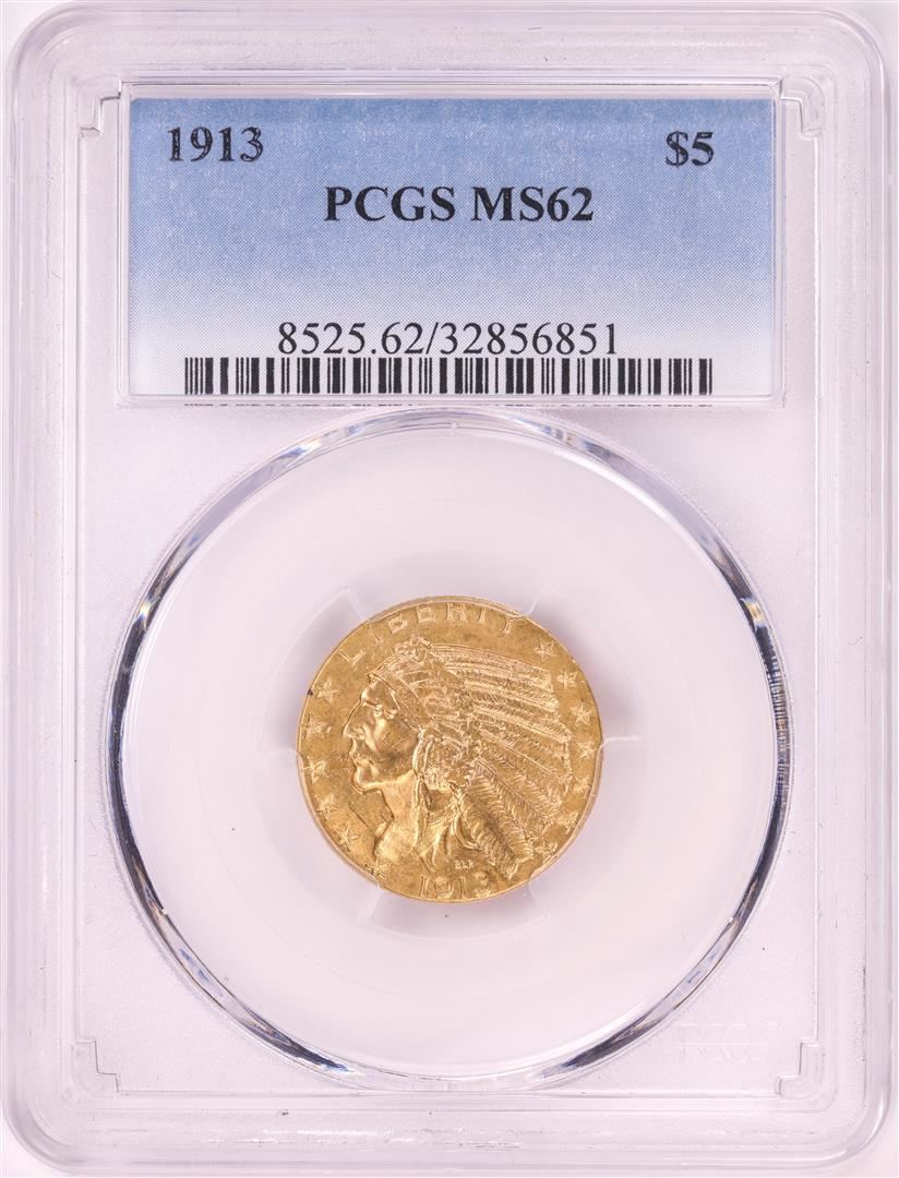 One 1913 $5 Indian Head Half Eagle Gold Coin PCGS MS62. PCGS Graded.