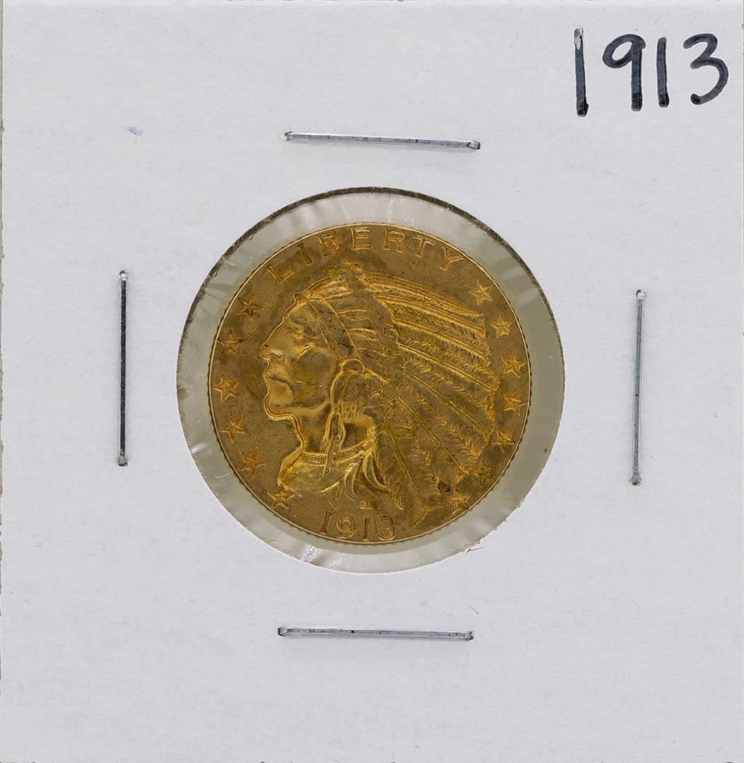 One 1913 $5 Indian Head Half Eagle Gold Coin.