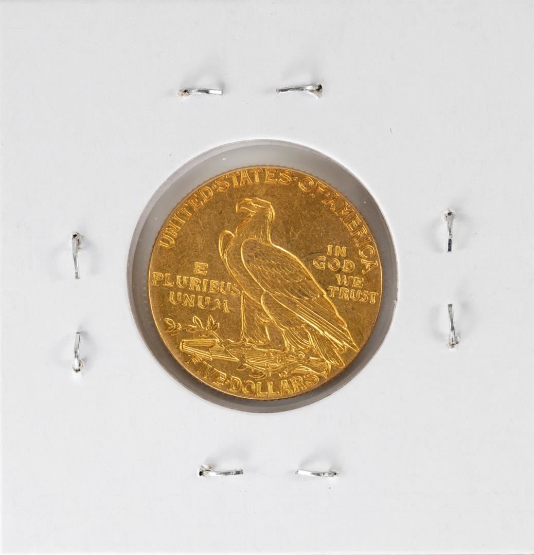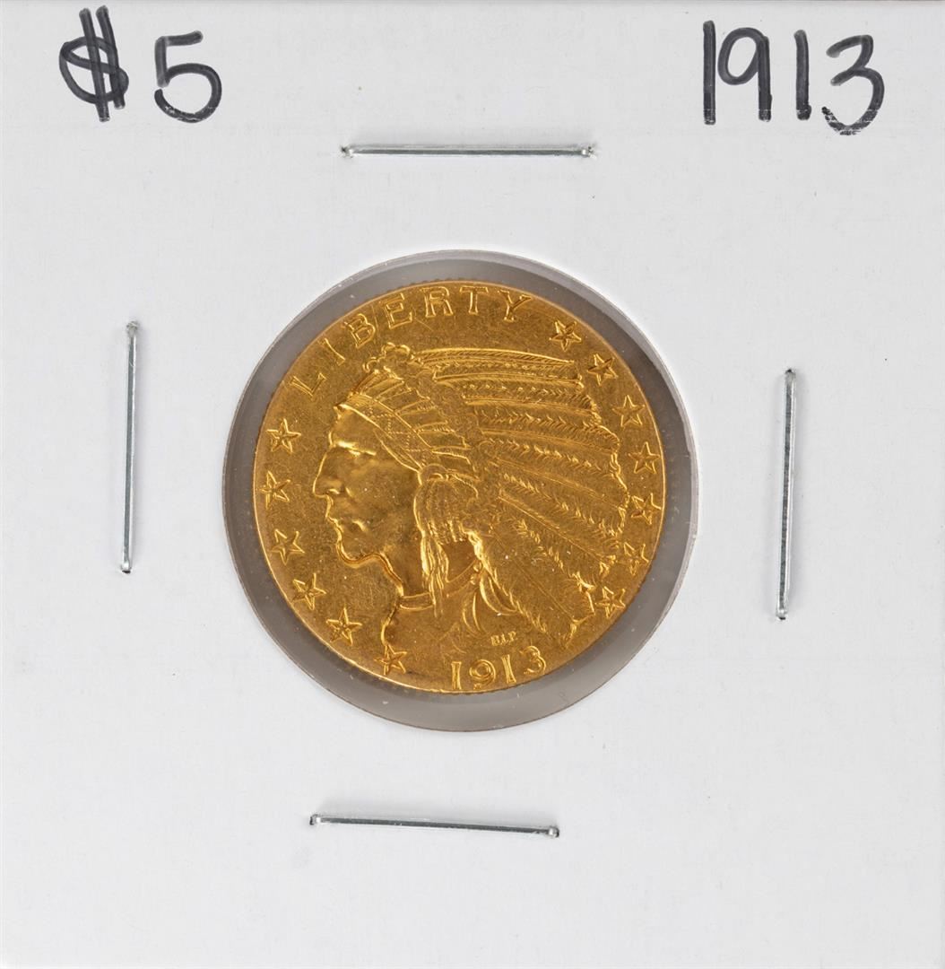 One 1913 $5 Indian Head Half Eagle Gold Coin.