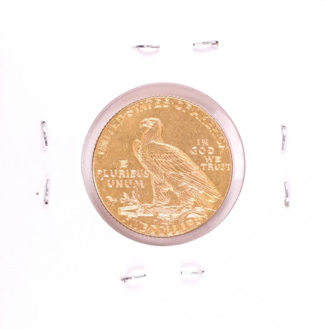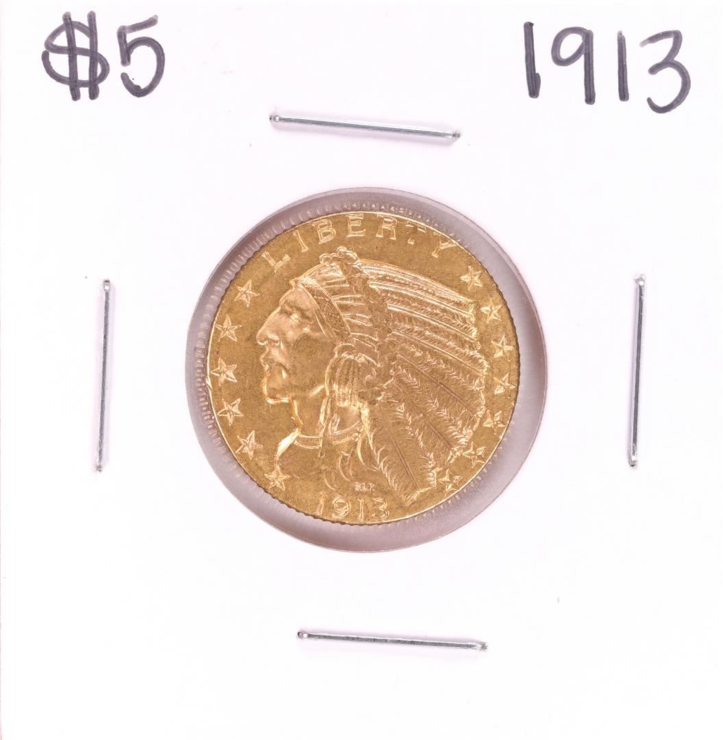 One 1913 $5 Indian Head Half Eagle Gold Coin.
