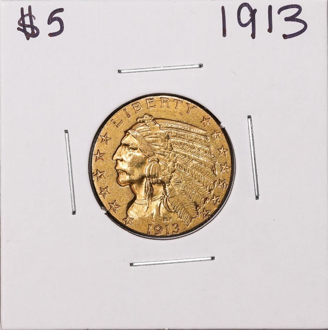 One 1913 $5 Indian Head Half Eagle Gold Coin.