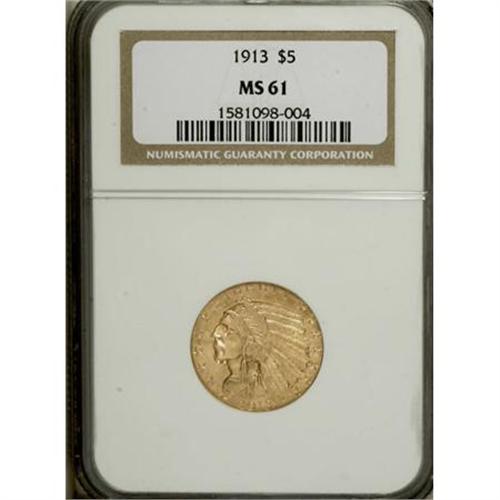 <B>1913 $5 MS61 NGC.</B></I> NGC Census: (1820/3632). PCGS Population (837/3336). Mintage: 915,900. Numismedia Wsl. Price for NGC/PCGS coin in MS61: $535. (#8525)<BR><BR><B>Coin Engraver:</B> Bela Lyon Pratt<BR><BR><b>Shipping:</b> Coins & Currency (<a target="_blank" href="http://www.heritageauctions.com/common/shipping.php">view shipping information</a>)