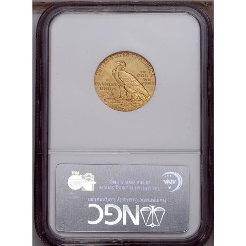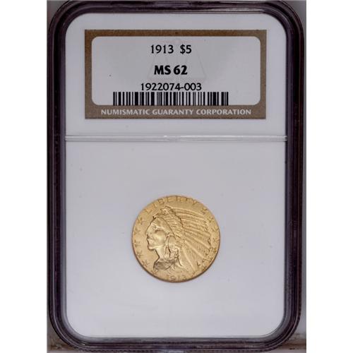 <B>1913<$5> MS62 NGC.</B></I> An intricately impressed and gently shimmering khaki-gold example. A few faint slide marks cross the fields, but the eye appeal is undeniable.