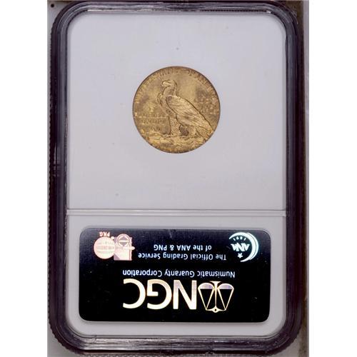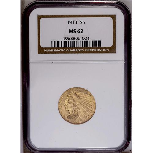 <B>1913<$5> MS62 NGC.</B></I> Bright and lustrous with outstanding sharpness over the central devices. A few paper-thin marks to the left of the Native American preclude Select status. <BR><BR><B>Important notice:</B> Heritage usually auctions material at the rate of 200-250 lots per hour. On some occasions eBay Live bid software or the Internet may not be able to keep up with the pace of the auction. We recommend placing a realistic absentee bid now as insurance to avoid disappointment. Occasionally the auctioneer may eliminate or reject an eBay Live bid, and the auctioneer may also reopen a lot after the close of the eBay live bidding (usually because we missed an audience bid), and may reject your bid even if it shows you as the winning bidder. By bidding via eBay Live, you agree that Heritage may award the lot to another bidder at its sole discretion under the circumstances described above or any other reasonable circumstances. Since eBay bids are not shown to us until we open the lot on the floor, we treat those bids just like floor bids. In most cases the floor responds before the eBay bid is presented to us, due to Internet lag time, so for consistency we have made it a policy that floor bids are always considered first over tie eBay live bids. Also please note that all Heritage lots purchased through eBay Live carry a 20% Buyer's Premium. Please make sure you read the Terms and Conditions before you bid. This lot is being auctioned in conjunction with a live floor auction by Heritage Galleries & Auctioneers. All final auction and invoice information will be supplied by Heritage Galleries & Auctioneers, and all other information should be considered preliminary. Lot:2893 <BR><BR><B>Winning Notification and Billing:</B> After the FINAL session in this auction is complete, Heritage will send e-mail and snail mail invoices. This process normally takes several days. All final auction and invoice information will be supplied by Heritage Galleries & Auctioneers, and all other information should be considered preliminary. <BR><BR>This auction will be conducted on a live auction floor and over the Internet through eBay Live. If you choose to place an absentee bid, please take a moment to <font color='#0000ff'><u><a href='http://pages.ebay.com/liveauctions/help/before/laabsentee.html'>learn how eBay Live absentee bidding works</a></u></font><font color='#000000'>