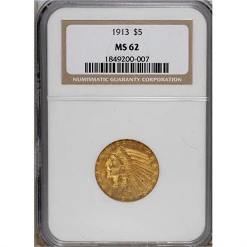 <B>1913 $5 MS62 NGC.</B></I> NGC Census: (2504/1062). PCGS Population (1815/1395). Mintage: 915,900. Numismedia Wsl. Price for NGC/PCGS coin in MS62: $1,175. (#8525)<BR><BR><b>Shipping:</b> Coins & Currency (<a target="_blank" href="http://www.heritageauctions.com/common/shipping.php">view shipping information</a>)