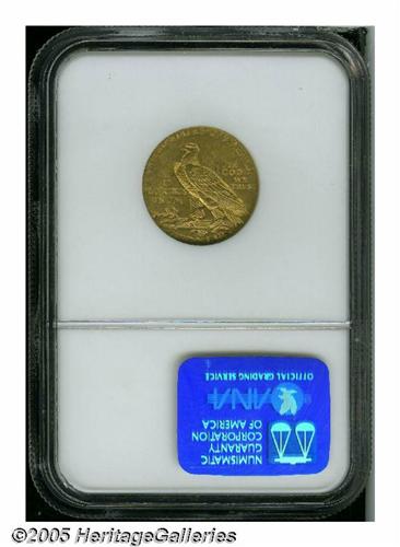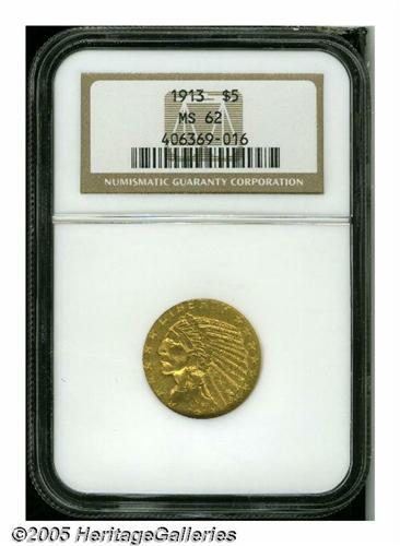 <B>1913<$5> MS62 NGC.</B></I> Semi-bright peach-gold surfaces display some grade-limiting marks on the Indian's cheek and in the upper reverse fields. Except for weakness on the eagle's shoulder, the design elements are well struck.